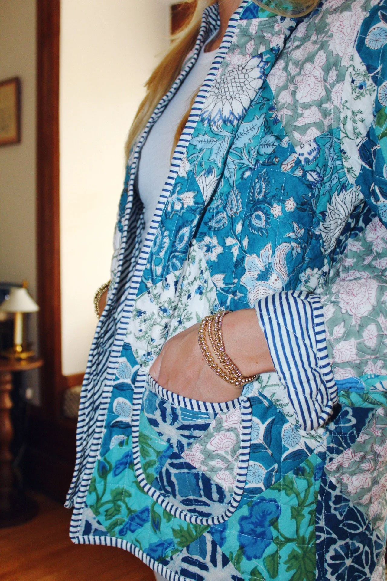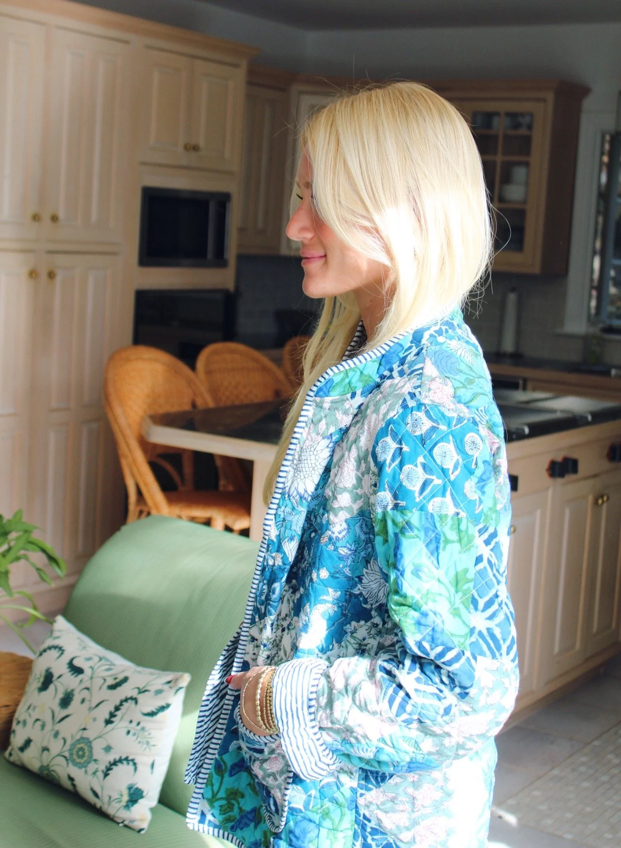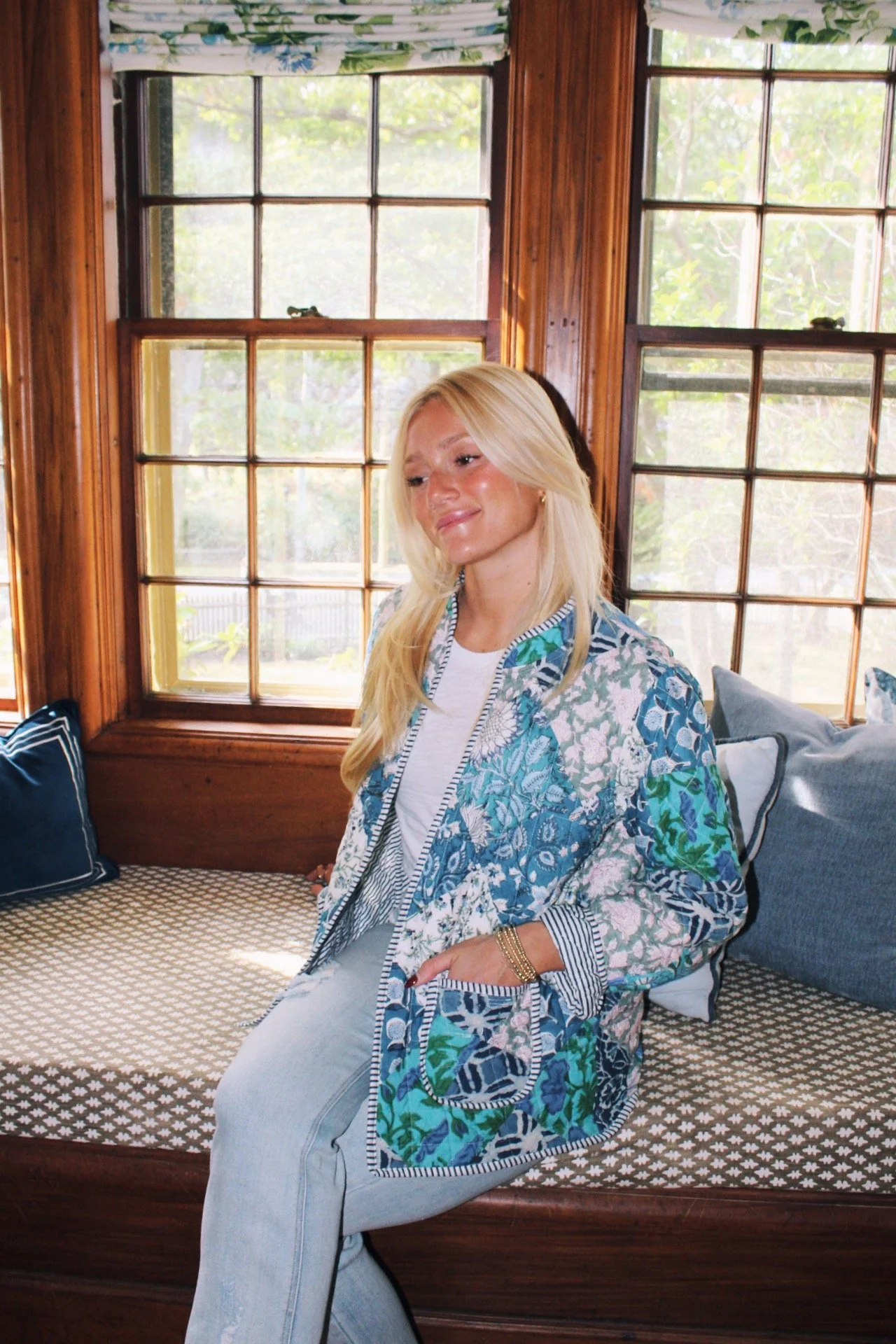 Our signature quilted jacket, crafted with coastal-inspired patchwork in shades of blue and green. Designed with intricate floral prints, striped trim, and a hand-stitched silhouette of Nantucket on the back, the Madaket Jacket is both timeless and unique. Lightweight yet cozy, it’s the perfect layer for breezy days by the water or casual evenings in town.